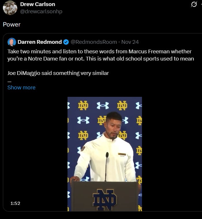 Hearing what ND football means to someone gave Freeman more life energy. And hopefully, more to his players. The kids in this generation are different, but it’s a product of the environment we’ve created. ‘We’ as in parents, TikTok, Instagram, legislation on college athletics, etc.