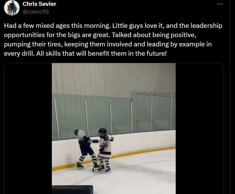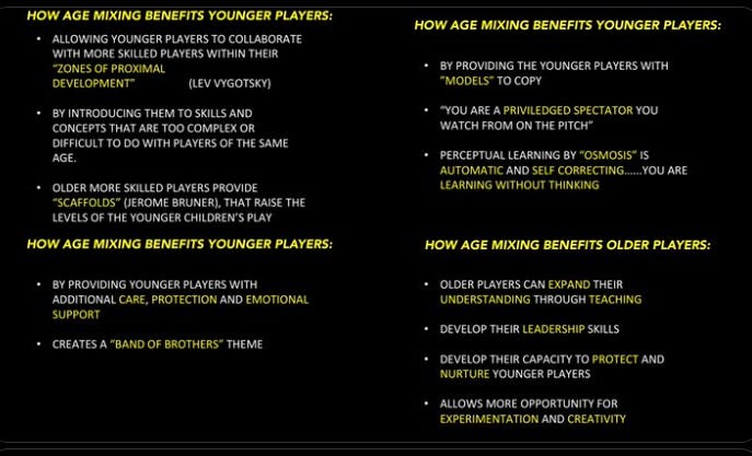Age-mixing is great, you can go down the rabbit hole of ‘Zone of Proximal Development’. Or, you can go for the essence which is more my speed by one of my favorite coaches: