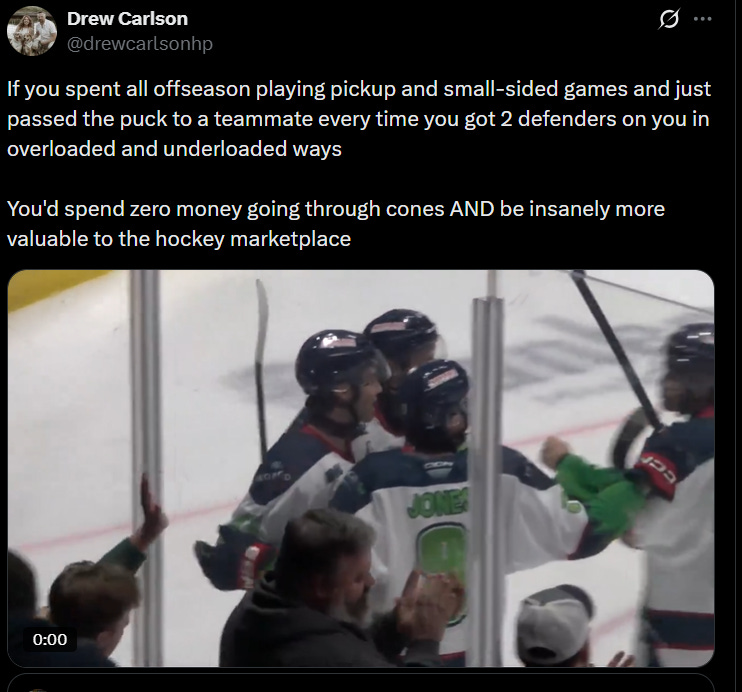 Playback speed×Share postShare post at current timeShare from 0:000:00/0:00Transcript1UNO Hockey Breakdown #6Changing Sides, Changing Quadrants, Creating Confusion, Getting to Shooting Space Off PuckIn-Powered CoachDec 31, 20251ShareTranscriptActions attempt to cause defensive confusionDefensive confusion creates a step on your manA step on your man elicits help/rotation drawing 2 to 1Drawing 2 to 1 begins the advantagePlaying zero seconds after that keeps the dominoes falling (pass, shoot or drive space)Discussion about this videoCommentsRestacksThe In-Powered CoachSubscribeAuthorsIn-Powered CoachRecent PostsKale Dach Off Heels Goal BreakdownJan 15 • In-Powered CoachSweden WJ Clip 6Jan 14 • In-Powered CoachSweden WJ Clip 5Jan 12 • In-Powered CoachSweden WJ Clip 4Jan 11 • In-Powered CoachSweden WJ Clip 3Jan 10 • In-Powered CoachSweden WJ Clip 2Jan 9 • In-Powered CoachSweden WJ Clip 1Jan 8 • In-Powered CoachUNO Hockey Breakdown 10Jan 7 • In-Powered Coach